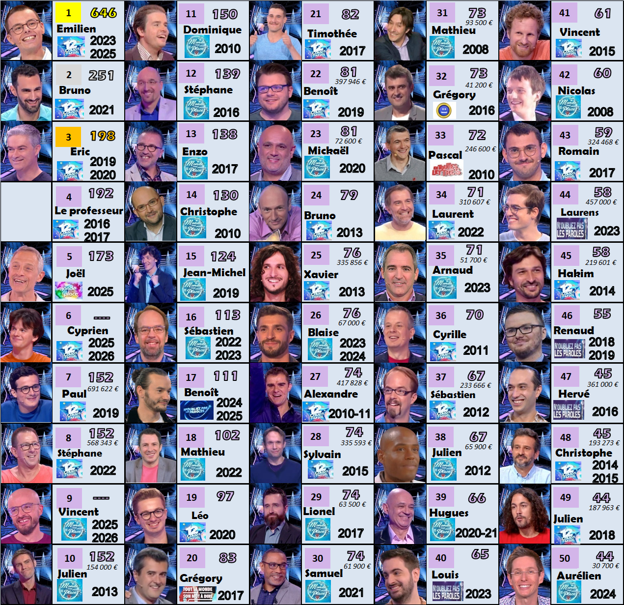 Qui sont les hommes ayant réussi à s’imposer durablement dans l’univers du jeu télévisé ? Découvrez le panorama complet des 50 plus grands champions de tous les temps.