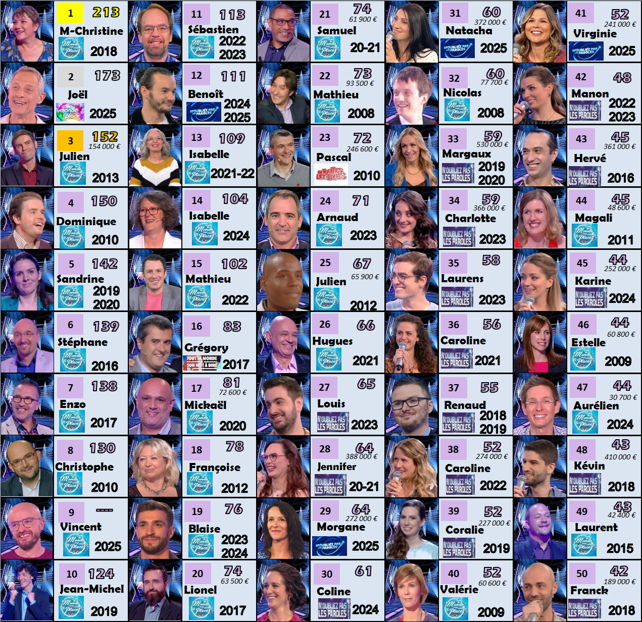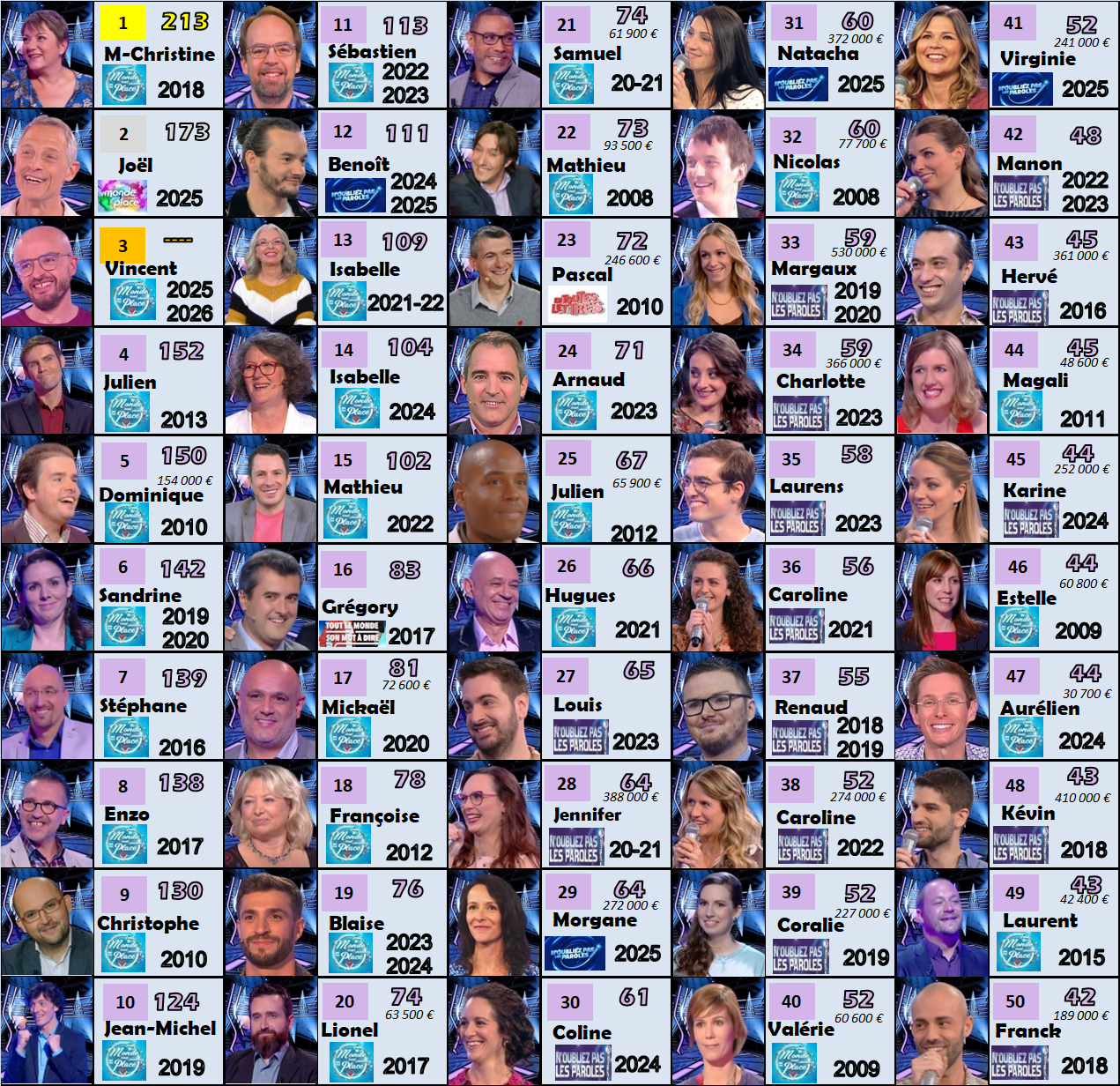 En se concentrant exclusivement sur les programmes diffusés sur France 2, quelles sont les 50 plus longues durées victorieuses de l’histoire des jeux télévisés ?