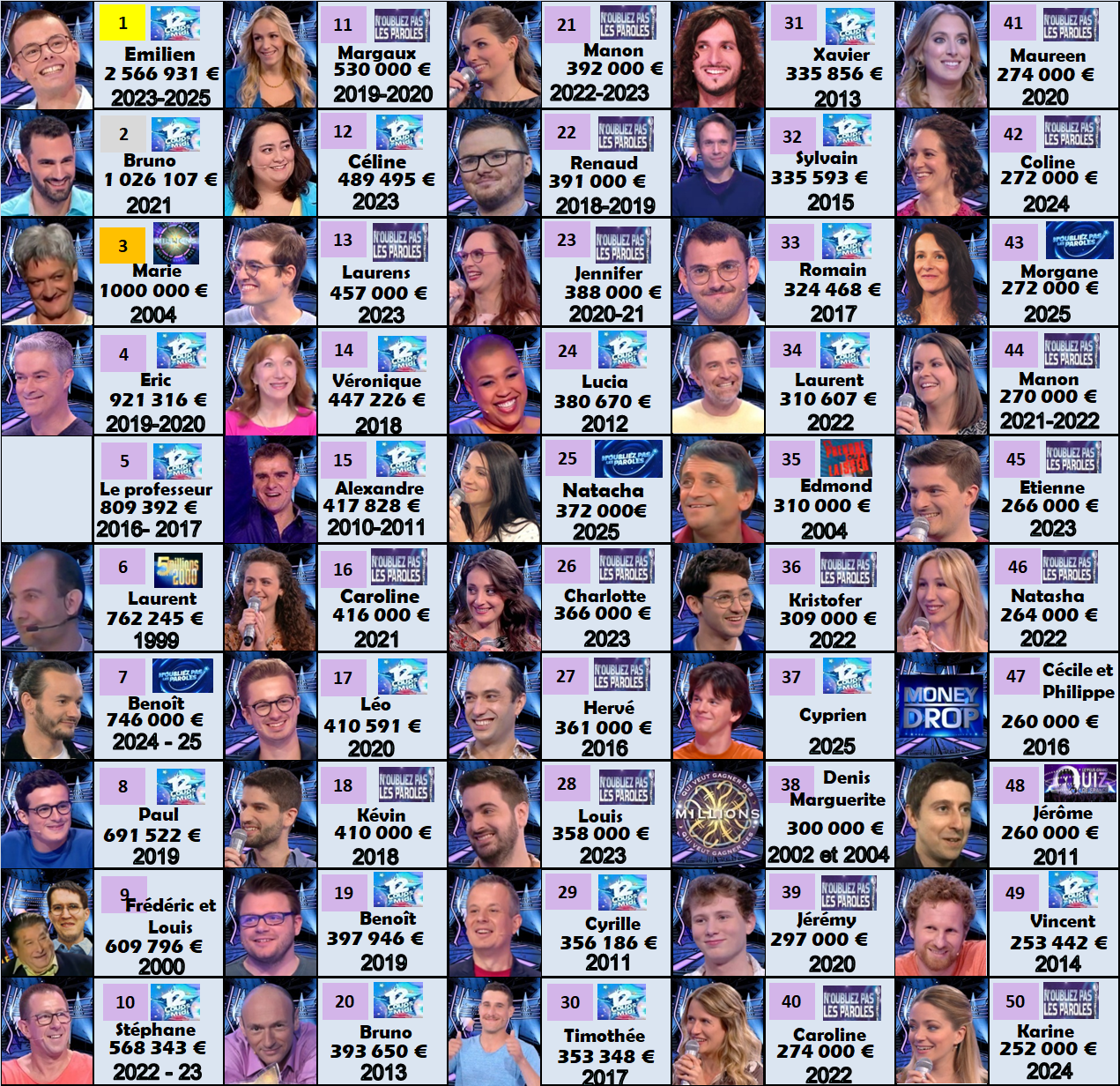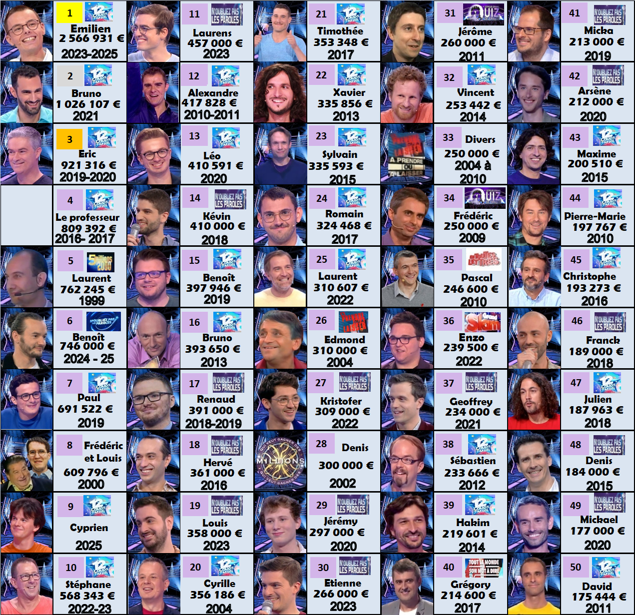 Découvrez ici le classement des 50 plus gros gains remportés par des hommes dans l’histoire du jeu télévisé français.