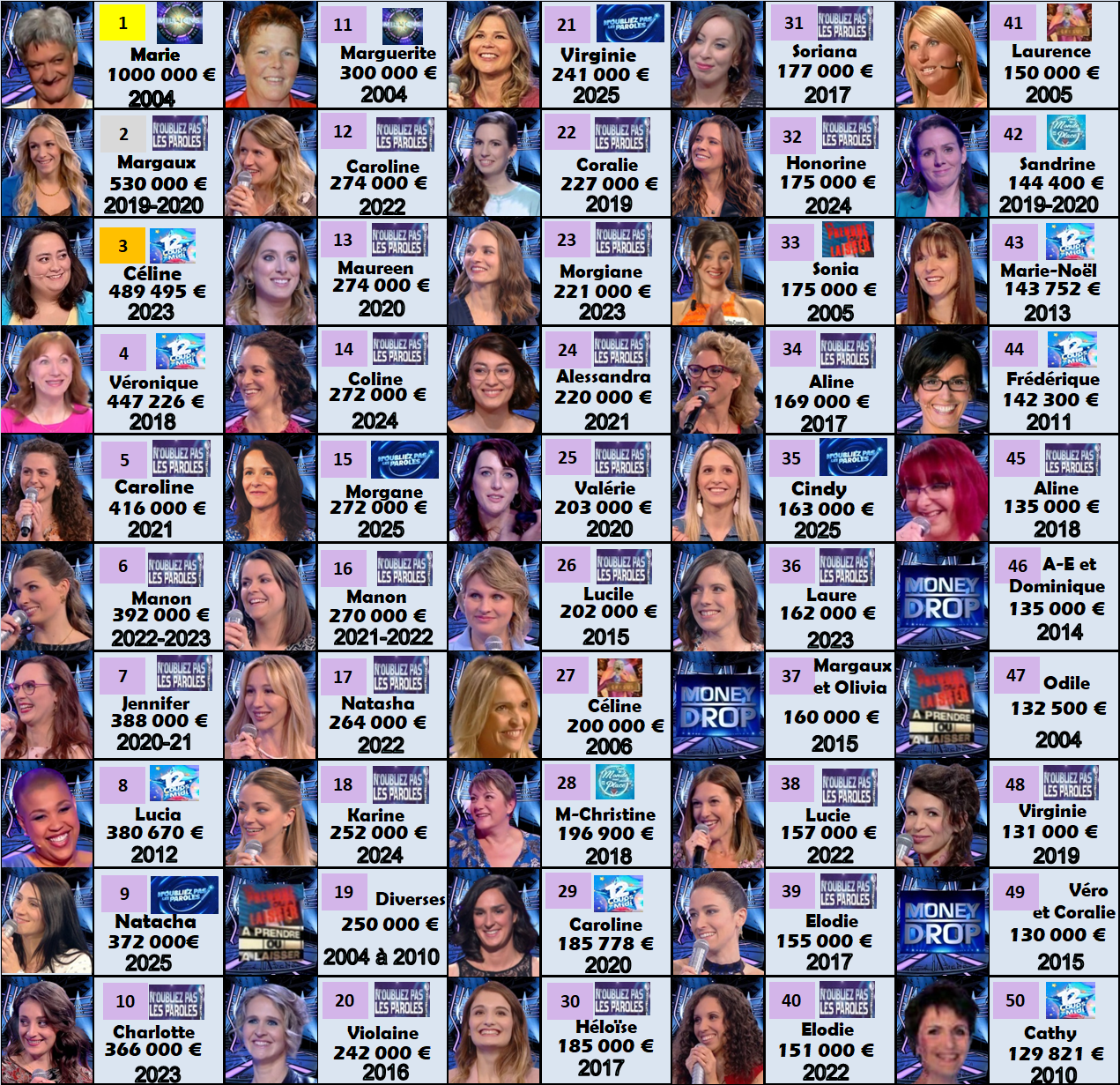 Quels sont les visages féminins qui ont amassé les plus belles cagnottes de la télévision française ? Tous jeux confondus, voici le classement des 50 plus gros gains.
